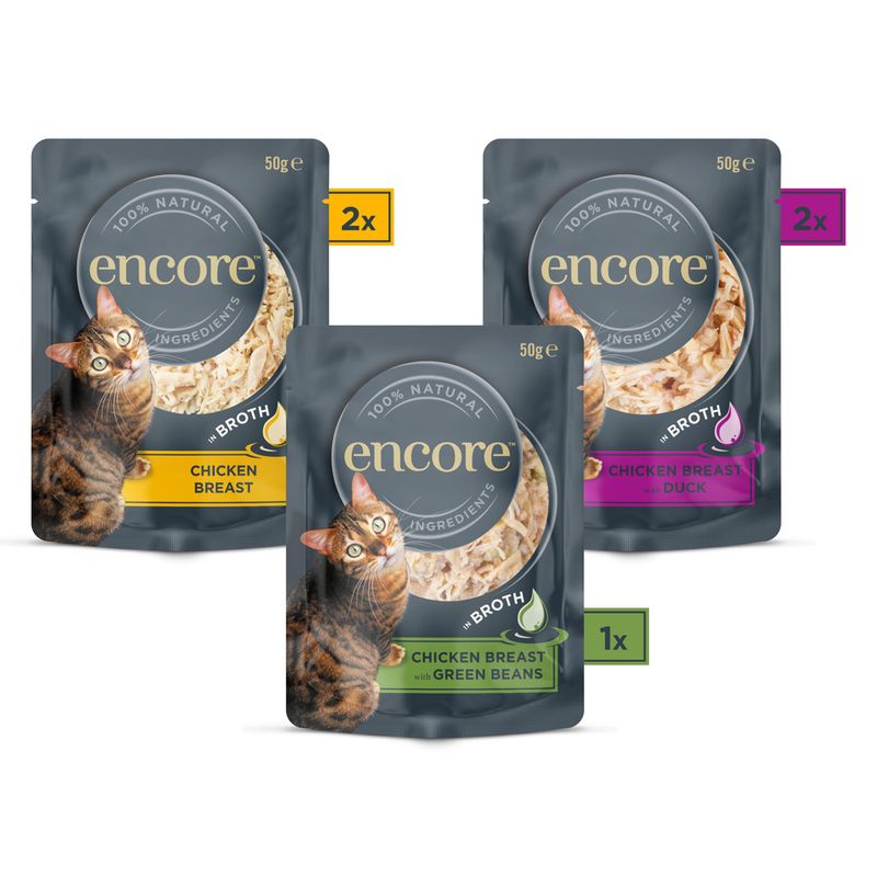 With a high moisture content in a rich broth, this wet food supports sufficient fluid intake, promoting overall feline well-being. The variety pack offers three different flavors per pack, ensuring a delightful dining experience for your cat. Make mealtime an adventure with Encore Cat Pouch in Broth 5 x 50g!