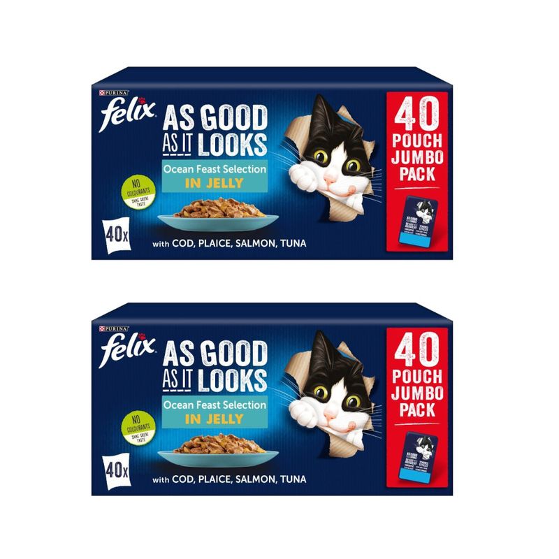 In this great-value jumbo pack, you'll find 80 x 100g pouches featuring four delectable varieties: Beef, Chicken, Cod, and Tuna. The Mixed Selection and Ocean Feast options add even more variety to your cat's menu.