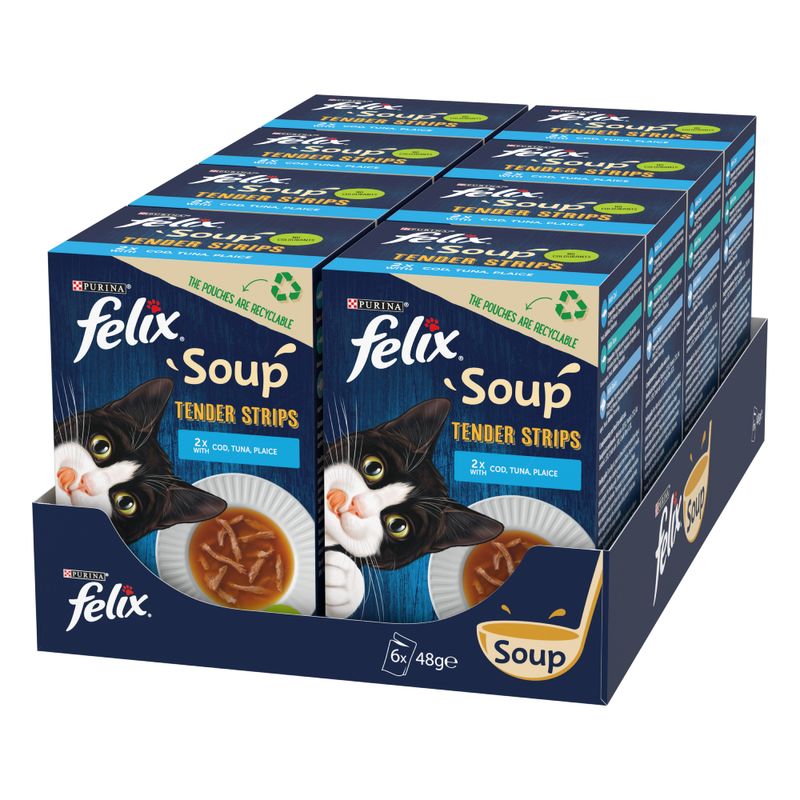 Feeding recommendation Felix Soup Tender Strips is a supplementary food for cats. For a 4 kg cat, serve one pouch per day in addition to a complete diet. For the health of your cat, please follow the feeding recommendation. Serve at room temperature. Always provide clean and fresh water. This product is a high-moisture supplement: part of your cat's recommended daily water intake will be met by consuming this product.
