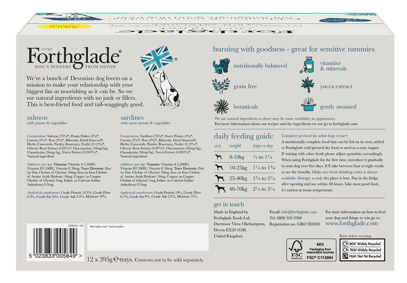 The hypoallergenic recipes of the dishes in this Forthglade Complete Meal Grain-Free Adult Dog - Fish Case are nutritionally balanced and include carrots and peas combined with either potato or sweet potato, which are all rich sources of beneficial vitamins, minerals and antioxidants, as well as being packed with essential fibre. The dishes are gently steamed using just a little water, to help ensure everything cooks slowly at a low temperature to retain key nutrients and unbeatable natural flavour. Prebiotics help to keep the intestine well-provided with good bacteria and natural botanical herbs support the body’s natural defences, whilst omega-3 keeps the immune system strong as well as offering benefits for the skin and coat.