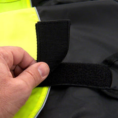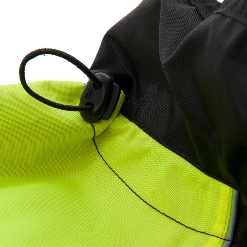 The Illume Nite Neon dog coat comes in various sizes, featuring a drawstring with a stopper for individual fitting, elastic hind leg straps for an optimum fit, and a 5cm adjustable chest strap for added comfort. The reflective sections along the back enhance safety in low visibility conditions.