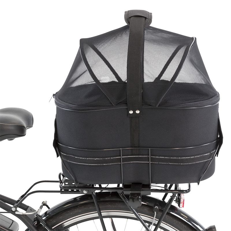 Integrated with a short lead, this bag ensures your dog's security, preventing any unplanned bids for freedom. The robust net cover offers excellent air circulation while safeguarding your pet. Its easy-to-open design allows adjustments mid-journey, addressing sudden weather changes. Reflective stripes along the sides enhance visibility during night rides.